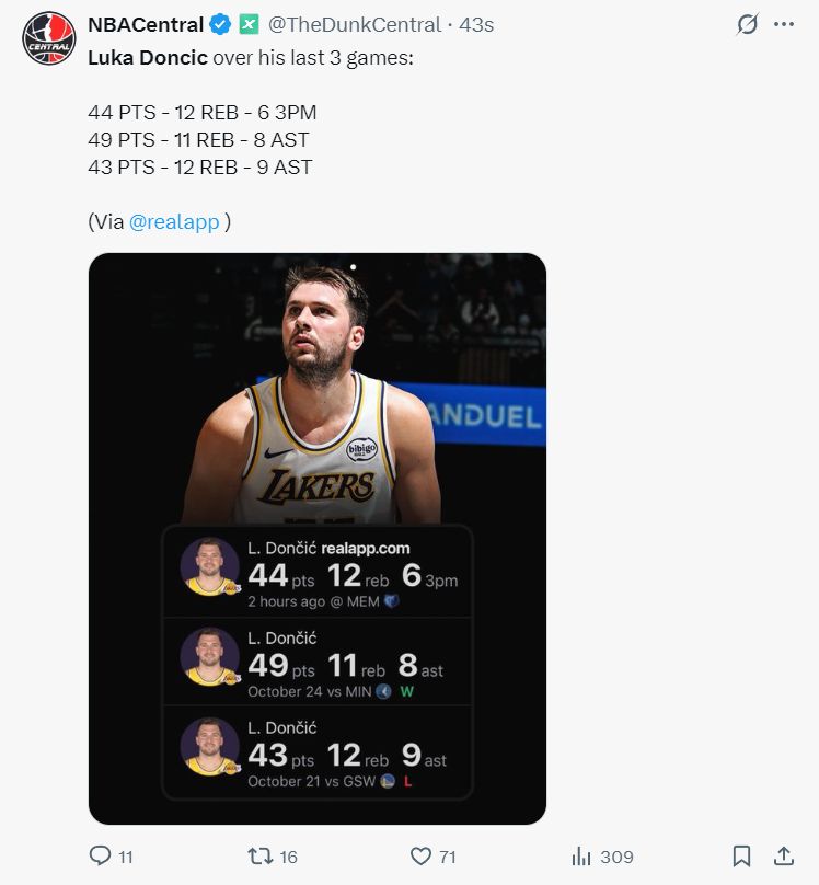 北京时间11月1日,卢卡-东契奇休息了5天后复出,实际上他的手部伤势还没有痊愈,但超巨就是超巨,他依旧可以打出现象级的表现,全场比赛44+12+6,湖人也以117-112击败灰熊。