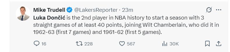 湖人记者:东契奇是联盟历史第二位开赛连续三场比赛都拿到40+的球员与张伯伦并列,张伯伦曾在1962-63赛季与1961-62赛季完成过。