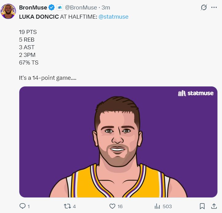 第二节东契奇赔上两个犯规,而且湖人的防守稀烂,单节让灰熊轰下42分,东契奇单节只拿6分,灰熊的奔跑战术拖垮湖人,东契奇半场19分5篮板3助攻,真实命中率67%完全不够。