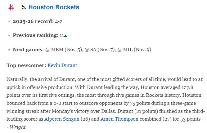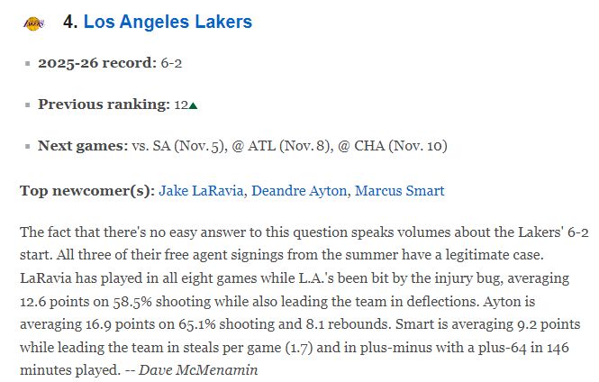 美国著名媒体ESPN公布最新一期的球队战力榜,8战全胜的卫冕冠军雷霆继续高居第一,马刺升至第二,掘金第三,湖人与火箭分列第四与第五,勇士跌至第13,杨瀚森所在的开拓者飙升20位升至第14,7战全败的篮网依旧联盟垫底。